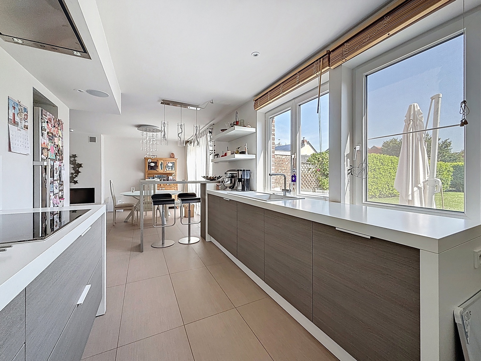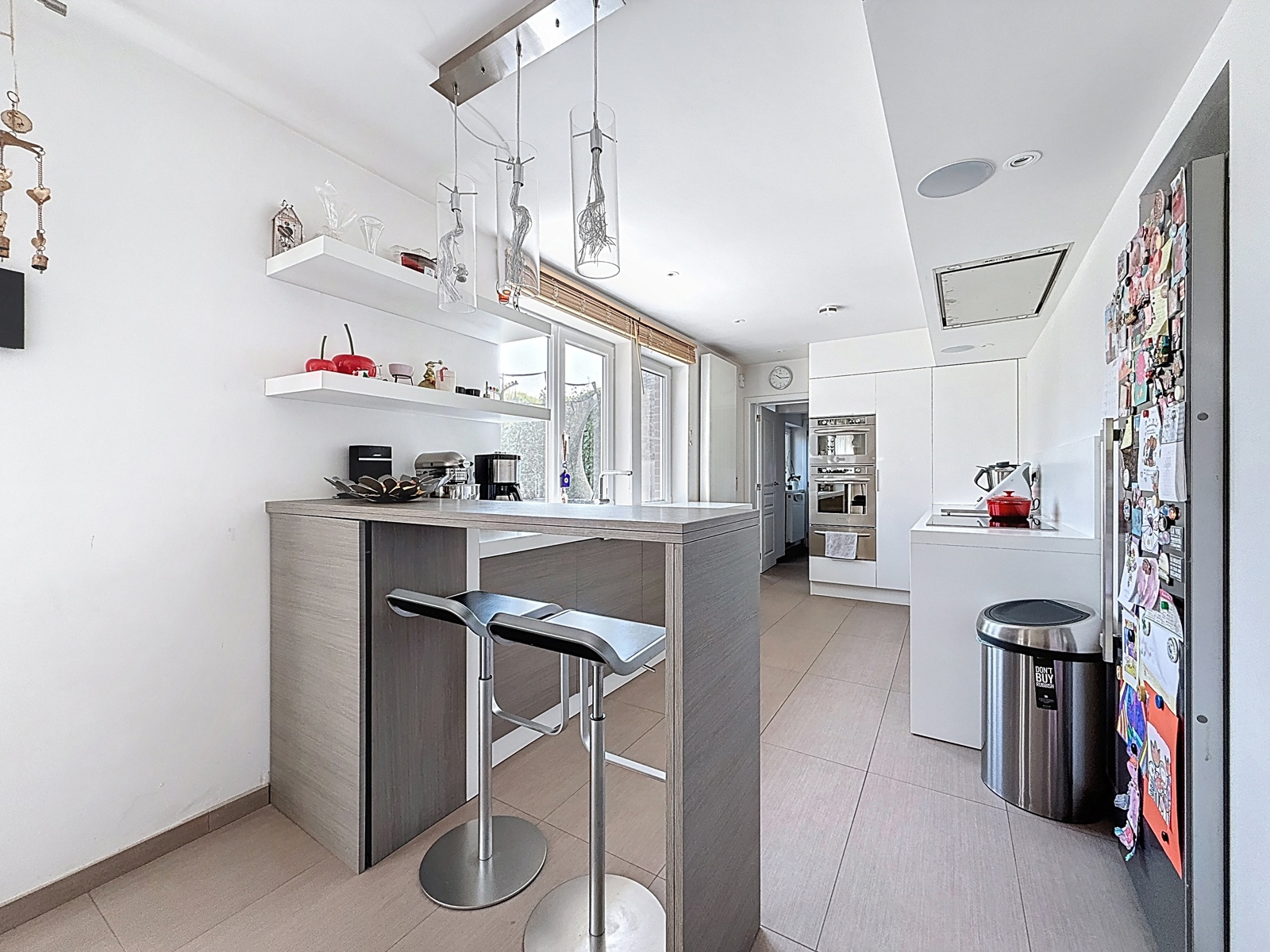Cuisine 13m² équipée : meubles, simple évier, four, taques induction, hotte, lave-vaisselle, four vapeur et chauffe-plat (électros Miele, Kitchenaid, Novy)